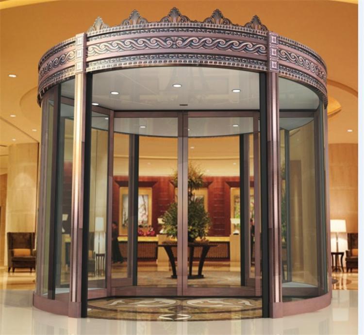 豪华型两翼旋转门最新设计:旋转门中隔断加设推拉式自动感应门,以便选择于寒冬,风沙及酷热时采用转门操作。春秋季节,室内外温差不大时,选用自动推拉挡门,不仅增加了人流量,还可以节省能源。用户完全可根据不同的季节、场合和需要,通过钥匙选择器方便的确定所需功能,或通过触摸屏直接控制,中间的自动平滑门既可单向通行、双向通行也可常开。特别适用于客流量较大的剧院、大型商场、酒店等场合。
